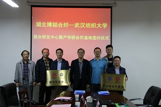 最后,校科技处处长冯军代表学校与博韬合纤签订了合作协议,刘在洲书记为联合研发中心和产学研合作基地授牌。