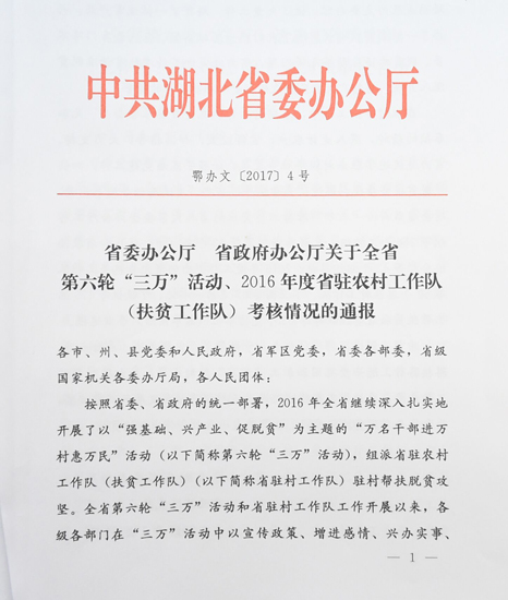 去年年底,由省人大常委会办公厅领导任组长,13个省直单位处级干部为成员的考核验收组到村里进行了实地考核,公司扶贫工作得到了大家的一致肯定,考核成绩位列全省省直驻村工作队前百分之20。考核结果经过省驻农村工作队办公室核查并报省委省政府领导同志同意后,省委专门发文表彰了一批攻坚成绩突出的驻村第一书记,公司对口帮扶贫困村南漳县九集镇双泉村驻村党支部书记郭俊同志名列其中。