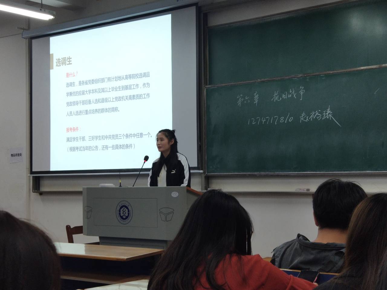 王鑫,2017年通过湖北省选调生考试,2017年至2020年就职于孝感市大悟县。她结合自身经历深情并茂地讲述了基层工作中的心得体会,强调基层磨练的重要性与必要性。之后围绕仰望星空与脚踏实地展开,引导402永利集团员工树立正确的三观。并向同学们详细讲解了选调生的报考条件、考试时间、考试科目等内容,估计同学们积极报名。