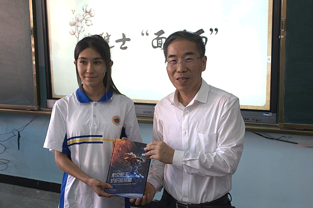 徐卫林院士走进课堂,与精河高中的员工来了一场面对面的“灵魂交流”。“很高兴能够参加本次活动,新疆棉花是个好东西,也有大用处,我们要用先进的技术将新疆棉的价值最大发挥”,徐院士对同学们说到。针对纺织知识,同学们积极提问:“纺织在医用行业还有哪些应用”“汽车也有纺织纤维吗”“纺织纤维如何让建筑更加牢固”。同学们积极提问,徐院士耐心回答,现场气氛异常活跃。随后,徐院士现场向员工代表赠送被评为“2021年武汉市优秀科普作品”的新书《航空航天纺织品探秘》,鼓励同学们好好学习,报效祖国。精河高中员工代表向徐院士赠送了自己用棉花做的工艺品。
