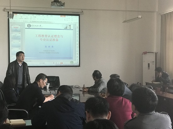 辅导会上,张尚勇剖析了工程教育专业认证的基本理念,详细介绍了《华盛顿协议》的基本要义、国内工程专业教育认证的体系。重点讲解了修订纺织工程专业人才培养方案的中的一些思考,提出了传统专业培养目标存在的主要问题。随后,他就如何做好当前专业认证准备工作,纺织工程教育专业认证过程中遇到的难点问题逐一进行了解析。最后他谈了一些认证后的收获与反思,期待以OBE为核心理念的个性化学习、针对性教学和科学化管理三位一体的新型教员工态早日实现。