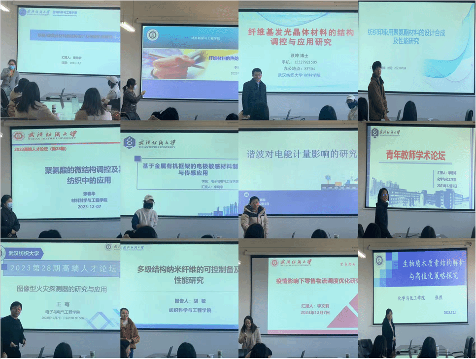 秦艳敏教师的报告题目是《铁基/碳复合材料的结构设计及储能机理研究》。她详细介绍了铁基/碳复合材料结构的特点。李娜教师的报告题目是《纤维材料的热防护与热管理应用》。聂坤教师报告的题目是《纤维基发光晶体材料的结构调控与应用研究》。张春华教师的报告题目是《聚氨酯的微结构调控及其在纺织中的应用》。李晓宇教师报告的题目是基于金属有机框架的电极敏感材料制备与传感应用。郑奕教师的报告题目是《谐波对电能计量影响的研究》。王骞教师报告的题目是《图像型火灾探测器的研究与应用》,他详细介绍了图像型火灾探测器的技术原理。胡敏教师报告的题目是《多级结构纳米纤维的可控制备及性能研究》。李文莉教师报告的题目是《疫情影响下零售物流调度优化研究》。贾慧英教师报告的题目是《老将出马的前因后果研究》。蔡学媛报告的题目是《电子商务环境下供应链多渠道多阶段库存分配研究》。卫增峰教师报告的题目是《纺织印染用聚氨酯材料的设计合成及性能研究》。张然教师报告的题目是《生物质木质素结构解析与高值化策略探究》。