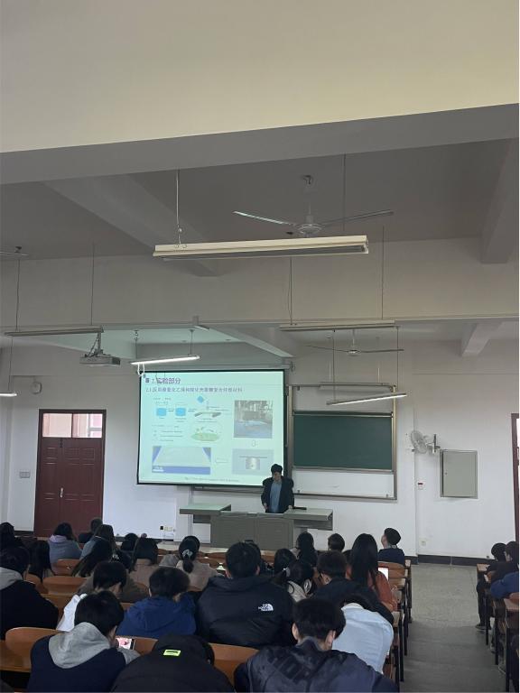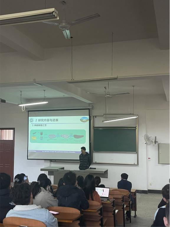 随后,李仁豪同学介绍了水溶性壳聚糖PEO抗菌敷料的制备,选择壳聚糖纤维敷料的原因是原料来源广泛、良好的生物相容性、有优异的抗菌性能等优点,并谈到了一般制备方法的缺点,以及实验部分如何制备和制备结果的讨论。
