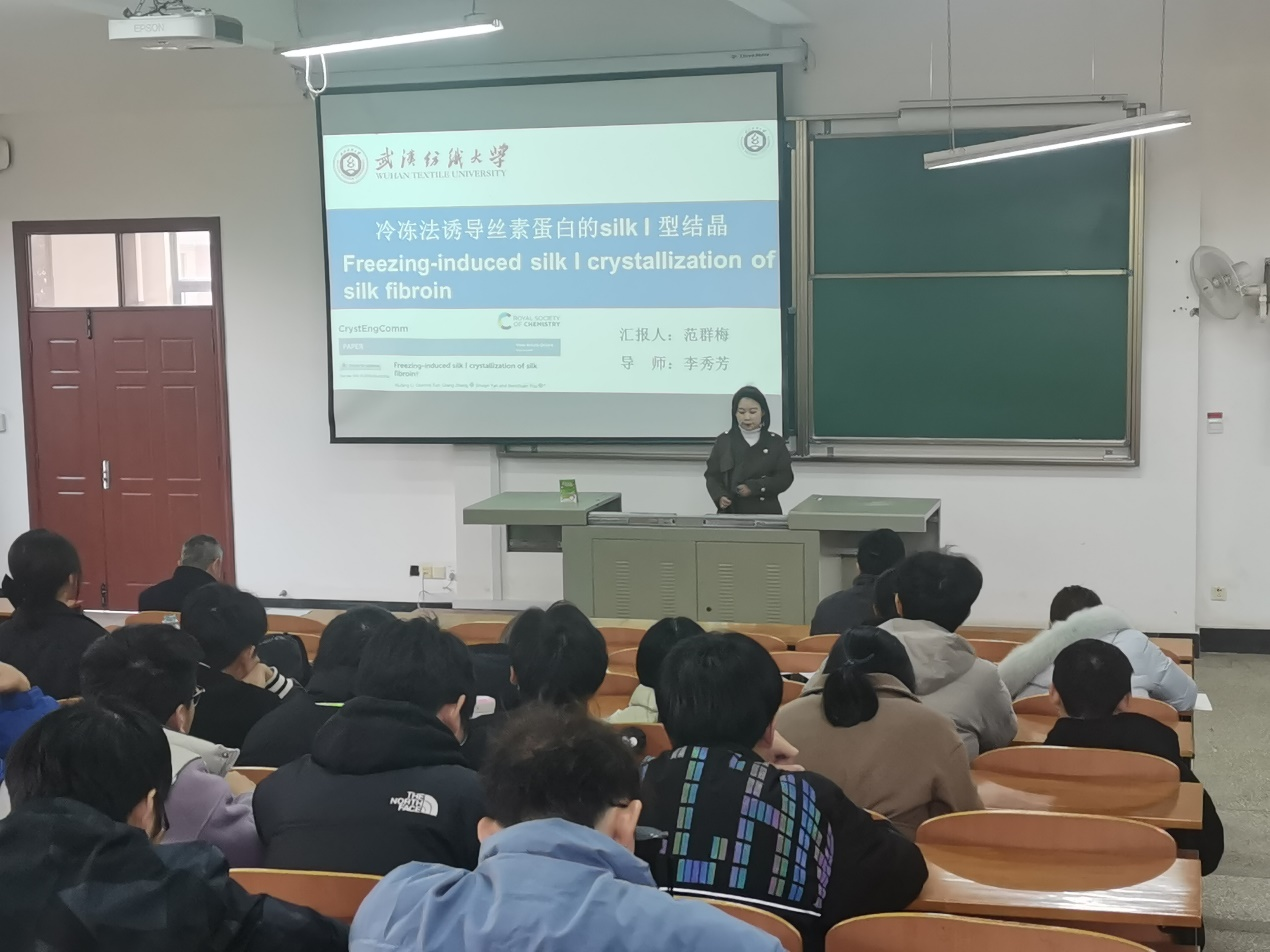 之后,范群梅同学介绍了一种天然纤维蛋白——丝素蛋白,其生物相容性和力学性能良好,在体内能够被生物降解,且对机体无过敏和免疫反应。该课题旨在通过冷冻法诱导丝素蛋白的Silk I型结晶的形成,将丝素蛋白通过不同温度、浓度和反应时间的冷冻处理,进而构建Silk I型结构的丝素蛋白中间体,以此来提升丝素蛋白的水稳定性、调节其力学性能和可降解行为。研究表明,通过冷冻退火处理,可直接制备Silk I型水溶性丝素蛋白。