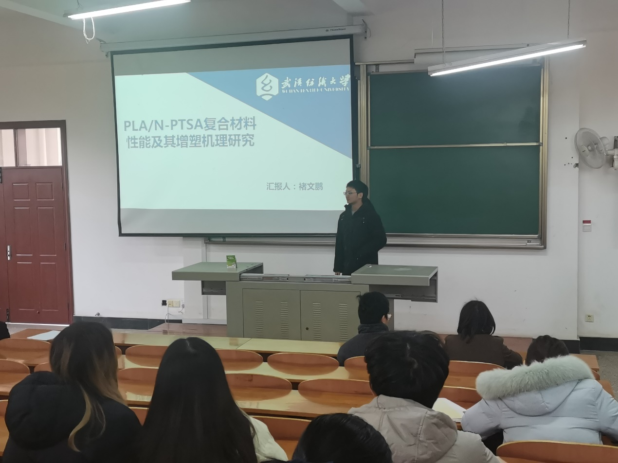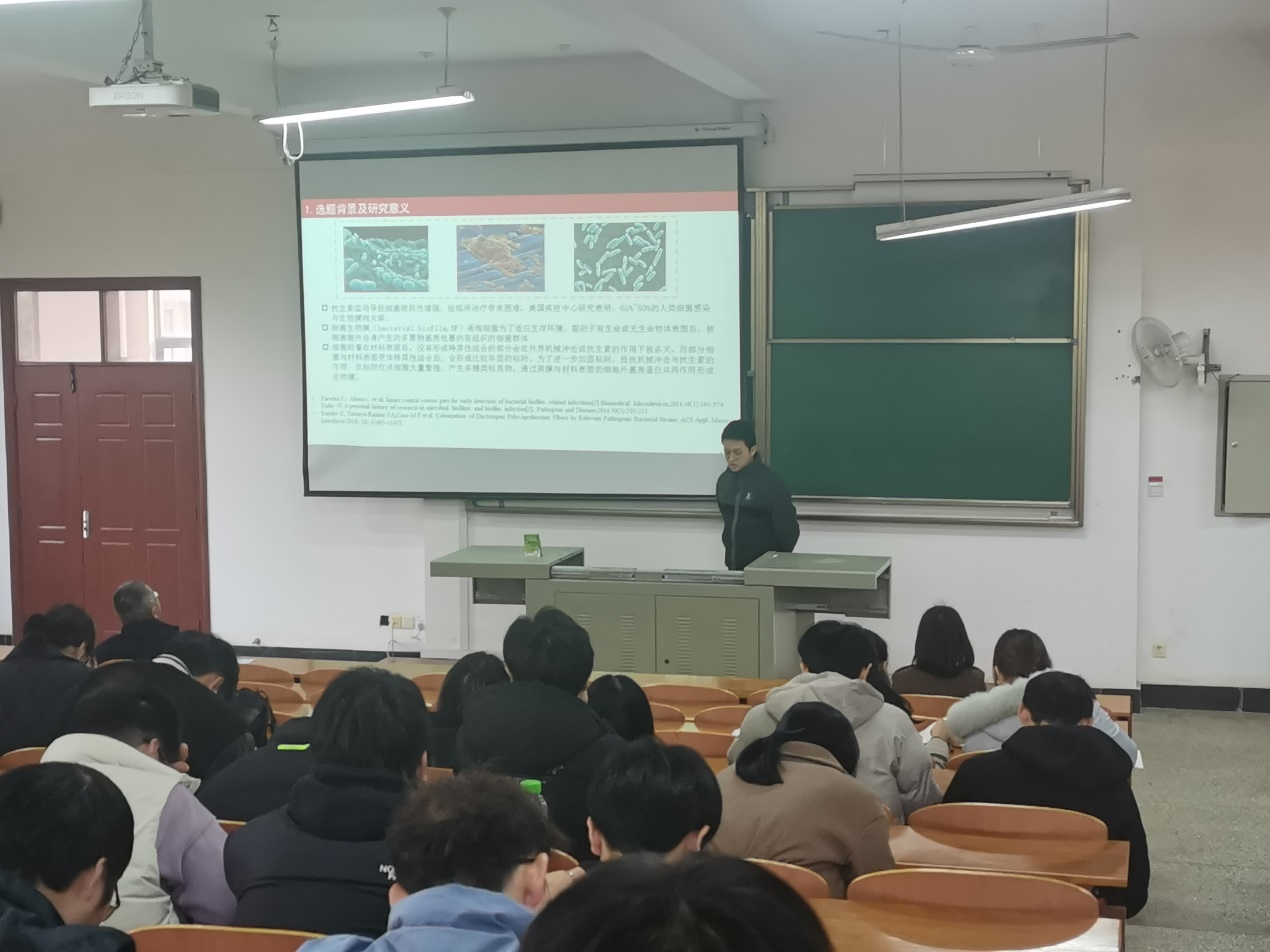 12月21日,402永利集团褚文鹏、范群梅、张焕三位19级研究生分别以“PLA/N-PTSA复合材料性能及其增塑机理研究”、“冷冻法诱导丝素蛋白的SilK I型结晶”和“基于细菌非特异性粘附的抗感染创面敷料的制备与研究”为主题给学院全体研究生做了专题报告。此次报告由副经理包海峰教授主持。