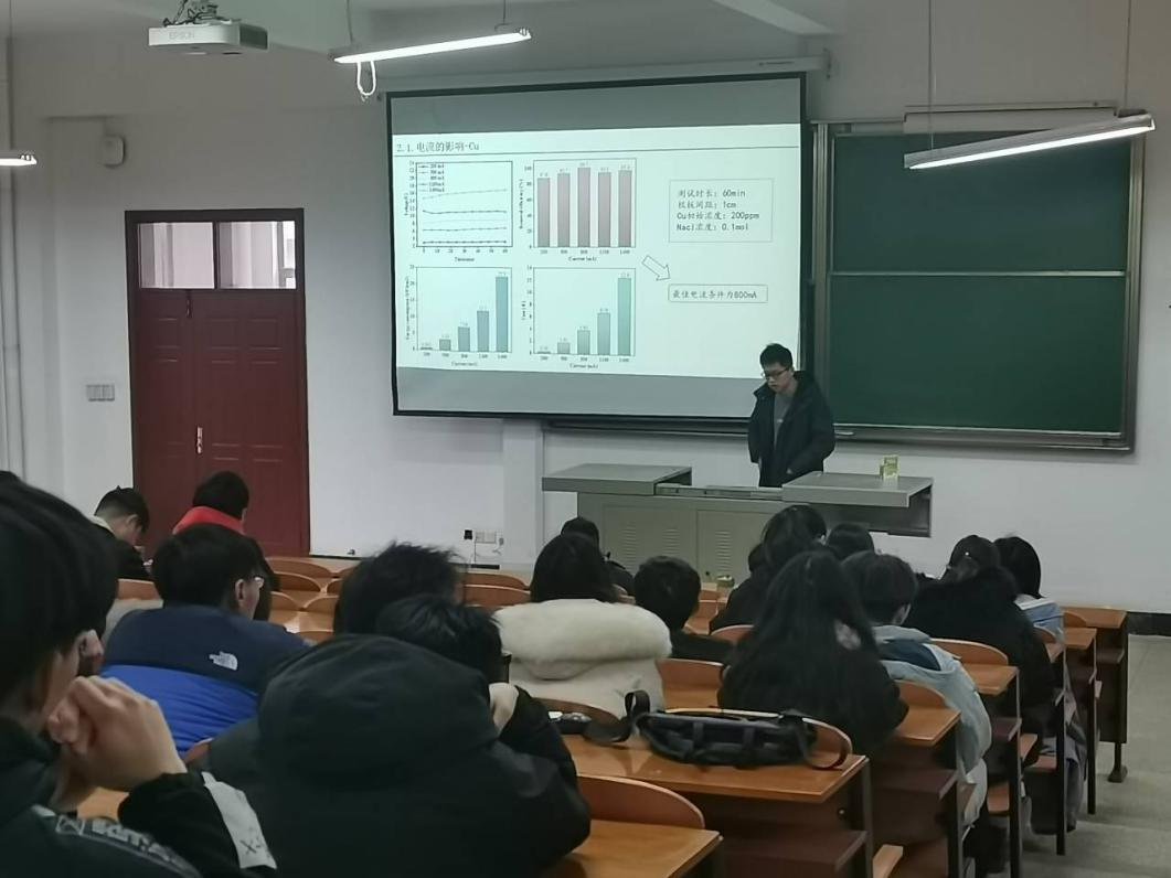 然后游松同学水泥基极板用于电絮凝去除重金属离子的研究进行讲解。 电絮凝特点,优点:去除污染物范围广,无需外加药剂,处理时间短,去除效率高,操作简便,可控性强。缺点:运行成本高,反应机理还在不断探索中,对不同污染物的去除需进行工艺参数的特征设计和优化。经过各种研究得出的结论为水泥基极板可有效用作电絮凝的阴极去除重金属离子。