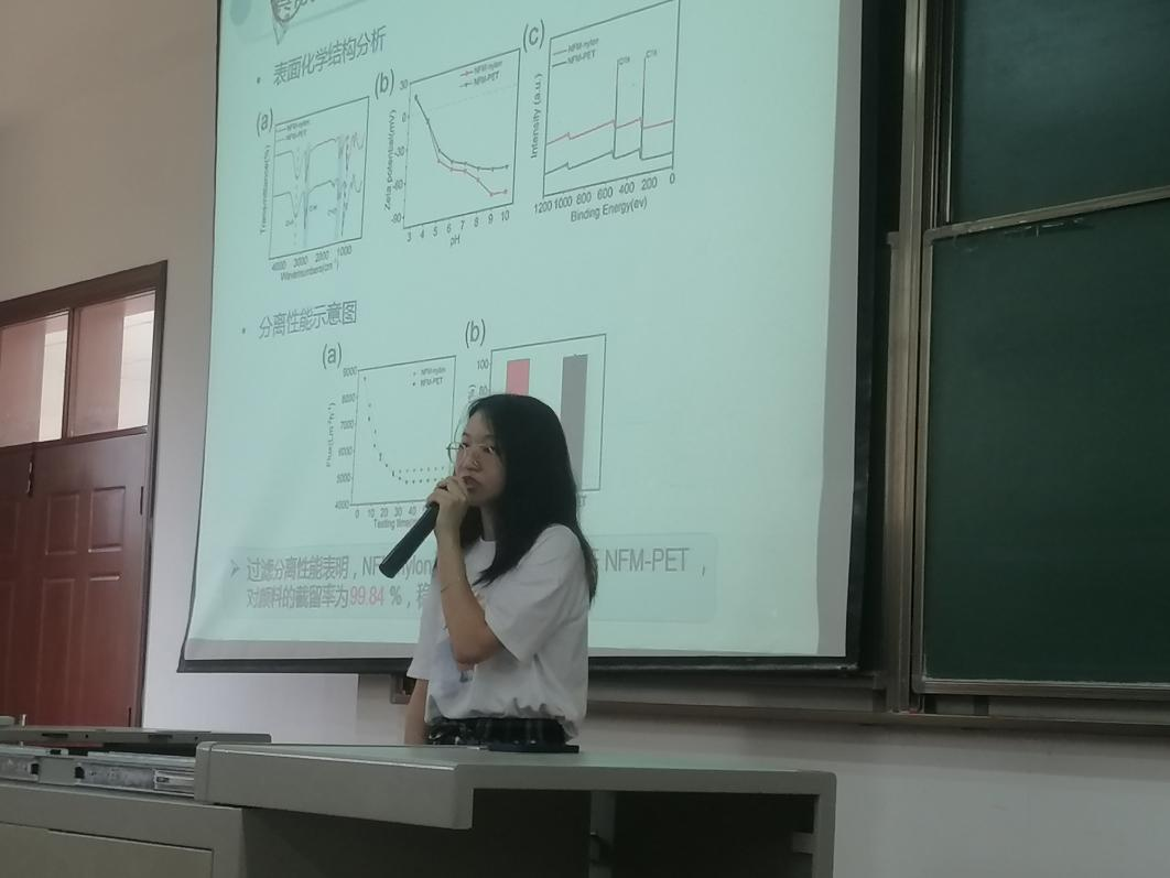 最后,马思琪同学对她的课题进行了讲解。具体讲述了她所制备的滤膜的制备方法,以及它的优点。