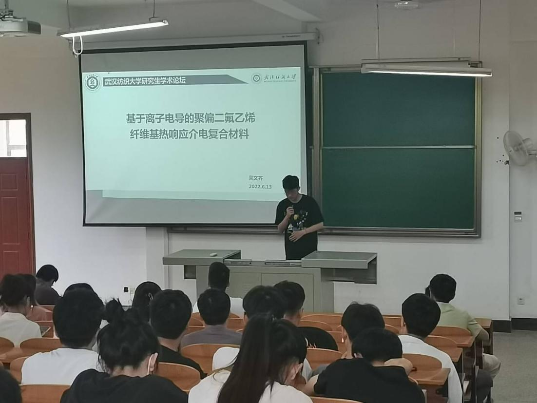 为加强院内师生间的学术交流,提高研究生素质和科研氛围。6月13日,402永利集团吴文齐、马思琪、刘方义三位同学分别为全体研究生做了以“基于离子电导聚偏二氟乙烯纤维基热响应介电复合材料”、“具有斜纹结构的EVOH纳米纤维基滤料膜的制备及性能研究”、“声速法测定丙纶动态弹性模量的参数优选”为主题的三场专题报告。