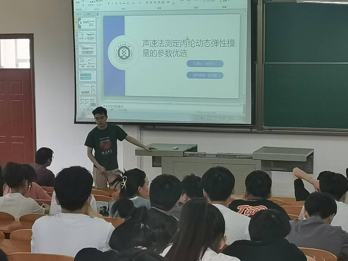 首先刘方义同学对他的课题进行讲解,讲解了一些声速法对这个实验测试的优点,以及在实验过程中遇到的一些困难和一些成果。