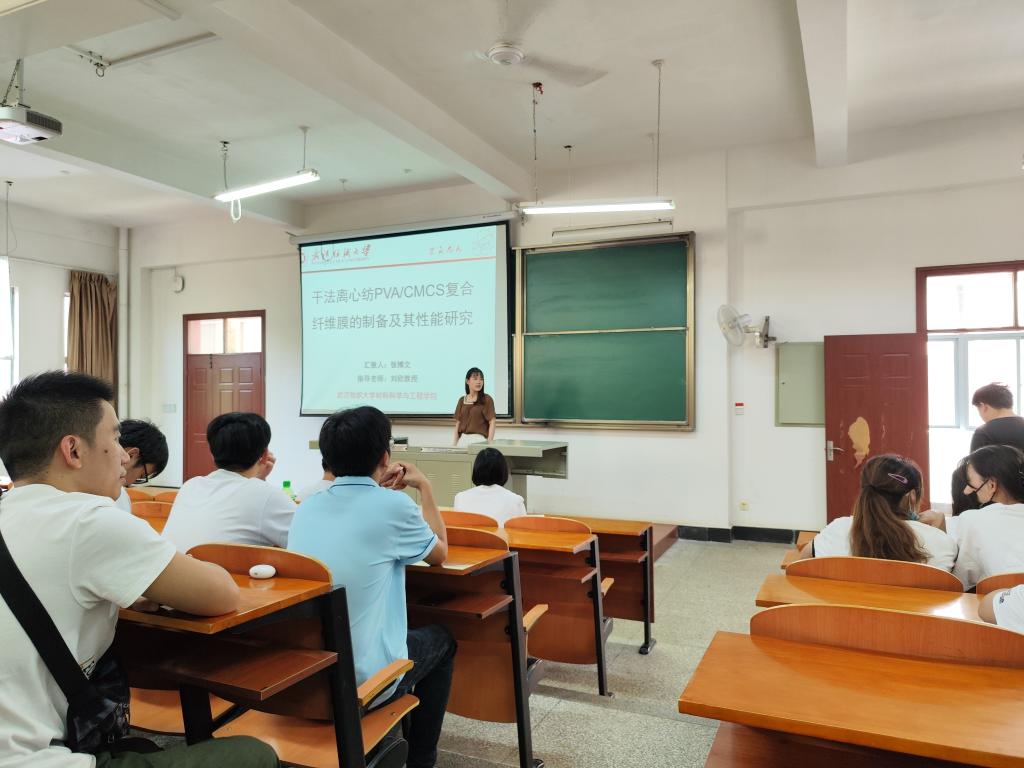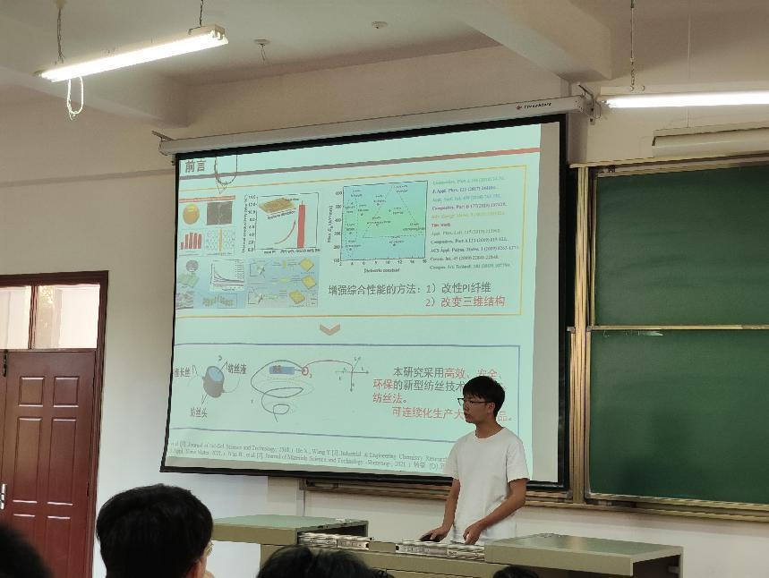402永利集团李星、钟佳锦、张博文三位同学分别给学院全体研究生作以“离心纺制备聚酰亚胺纤维纸及其绝缘性能研究”、“ZrO2/Si-C-O多相柔性陶瓷纳米纤维的制备和性能研究”和“干法离心纺PVA/CMCS复合纤维膜的制备及其性能研究”为主题的三场报告。