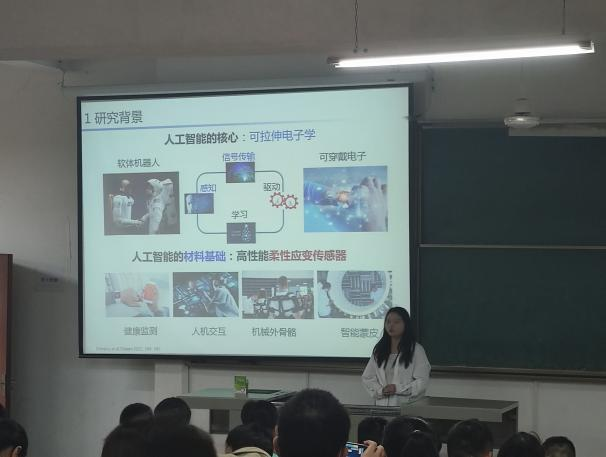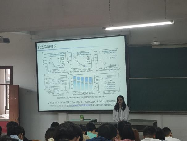 首先,胡钧介绍了他的研究成果,题为“聚酰亚胺超细纤维的制备及其高温过滤性能研究”。他对这种材料在材料科学领域的用途进行了深入的研究,并强调了其在材料特性描述方面的关键作用。接下来,陈青青详细介绍了她的研究题目:“厚朴酚基泡沫的制备及应用在创面愈合方面的可行性探讨”,分享了在制备厚朴酚基泡沫的制备方法以及其实际应用性能。最后,刘粤美报告了“具有高灵敏度和色彩适应性的聚氨酯基应变传感器”,给我们介绍了这项研究的研究背景以及其相关应用。