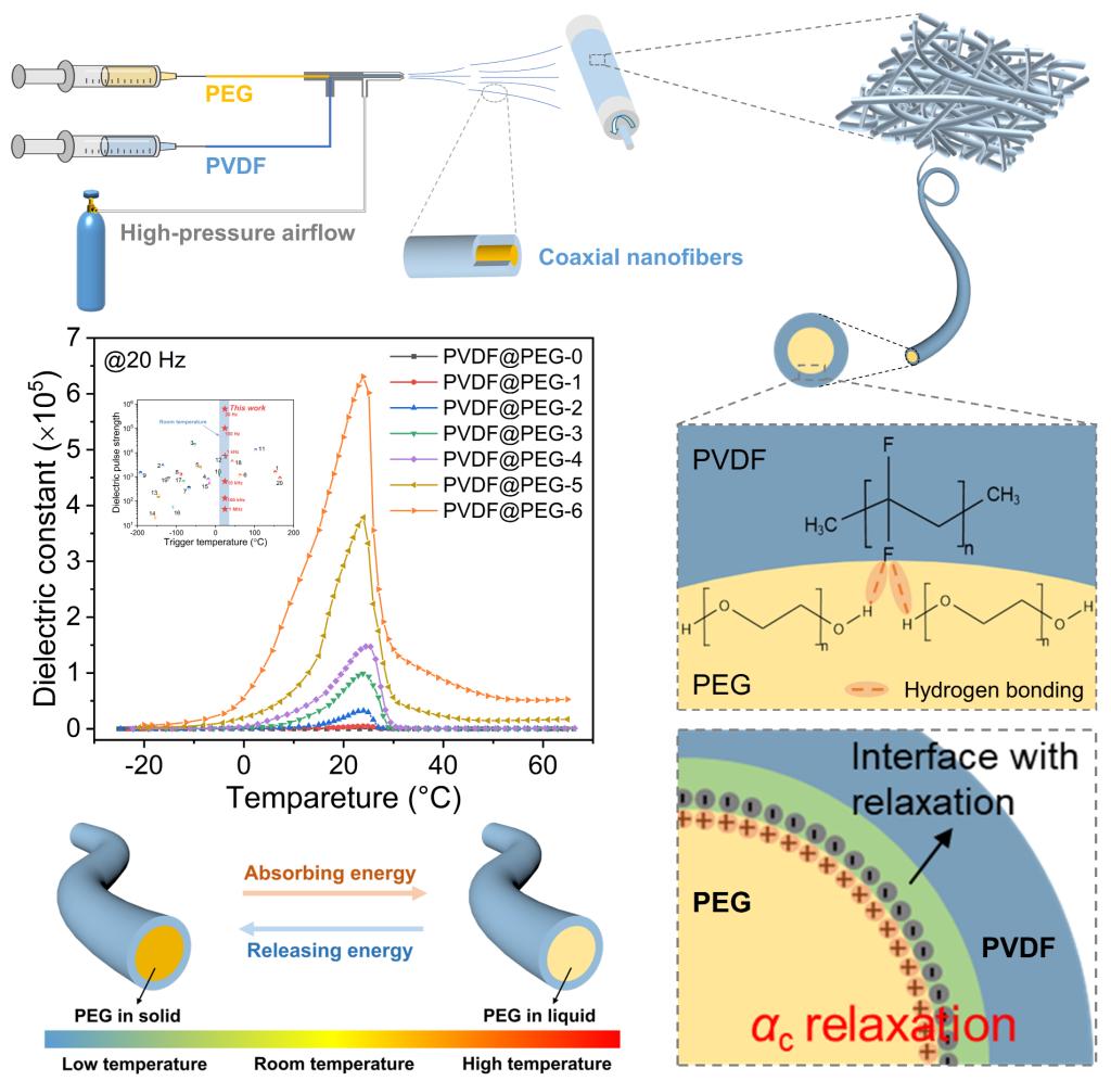 随着智能电子/电气系统的快速发展,对热敏介电材料的需求日益迫切。虽然不同类型和结构的热响应介电材料不断被报道,但它们的介电响应行为都源于热力学相变。在本研究中,姜明团队证明了聚偏二氟乙烯 (Poly(vinylidene fluoride), PVDF) 中的结构弛豫,一种非热力学相变,可以在室温下诱导产生显著的热响应介电脉冲。通过连续吹塑纺丝工艺制造的聚乙二醇 (polyethylene glycol, PEG)-PVDF同轴纳米纤维膜 (PVDF@PEG) 可以在24 °C下实现高达6.3×105的介电脉冲强度 (20 Hz)。此外,该纤维膜表现出优异的柔韧性、可调的强度和韧性、可切换的亲水/疏水性以及有效的热管理能力。弛豫诱导介电脉冲效应、突出的多功能性和简单、连续、安全的制备相结合,促进了PVDF@PEG复合纤维的可扩展性和应用前景。特别是弛豫诱导介电响应机制的发现,为热响应介电材料设计和制备提供了一种新的策略。