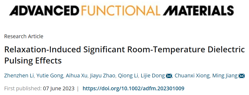 近日,材料领域国际知名期刊《先进功能材料》(Advanced Functional Materials)在线发表402永利集团姜明副教授团队在热响应介电材料领域的重要进展,相关工作以“Relaxation-Induced Significant Room-Temperature Dielectric Pulsing Effects”为题发表在Advanced Functional Materials上。文章链接:https://doi.org/10.1002/adfm.202301009。402cc永利官网为该论文的第一署名单位,402永利集团姜明副教授为论文责任通讯作者,402永利集团硕士研究生李珍珍为论文第一作者。该项工作得到了国家自然科学基金(51503158)的资助。本论文是该团队在最近一年内的第三篇Advanced Functional Materials。