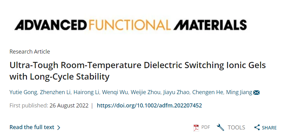 2022年8月26日,材料领域国际顶级期刊《先进功能材料》(Advanced Functional Materials,影响因子19.924)在线发表402永利集团姜明副教授团队在热响应介电材料领域的重要进展,相关工作以“Ultra-Tough Room-Temperature Dielectric Switching Ionic Gels with Long-Cycle Stability”为题发表在Advanced Functional Materials(DOI:https://doi.org/10.1002/adfm.202207452)。402cc永利官网为该论文的第一署名单位。