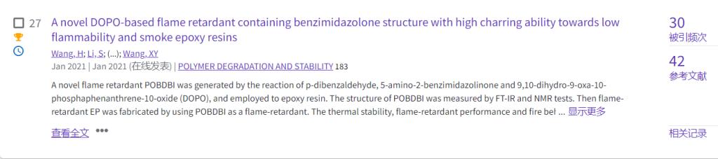 近期,根据ESI(基本科学指标数据库)最新数据显示,402永利集团朱宗民老师2021年发表于阻燃材料领域TOP期刊Polymer Degradation and Stability的研究成果《A novel DOPO-based flame retardant containing benzimidazolone structure with high charring ability towards low flammability and smoke epoxy resins》入选了由Web of Science识别的高被引论文。该论文以402cc永利官网为第一完成单位,朱宗民为第一通讯作者,研究生王浩为第一作者。ESI高被引论文是指在ESI学科分类中,一篇论文在ESI收录时间范围(十年)内的被引频次位于该学科所有论文的前1%,则称该篇论文是高被引论文。此类论文通常在其研究领域具有较高的影响力,是其研究成果得到学术界广泛关注的直接体现。此外,ESI高被引论文已成为教育部学科评估中重要指标之一。