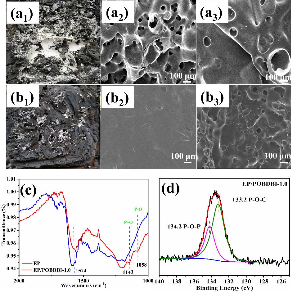 图2. EP(a1)、EP/POBDBI-1.0(b1)的数码照片;EP(a2、a3)的外部和内部残炭、EP/POBDBI-1.0(b2、b3)的外部和内部残炭的SEM图像;残炭的红外(c)以及XPS图(d)