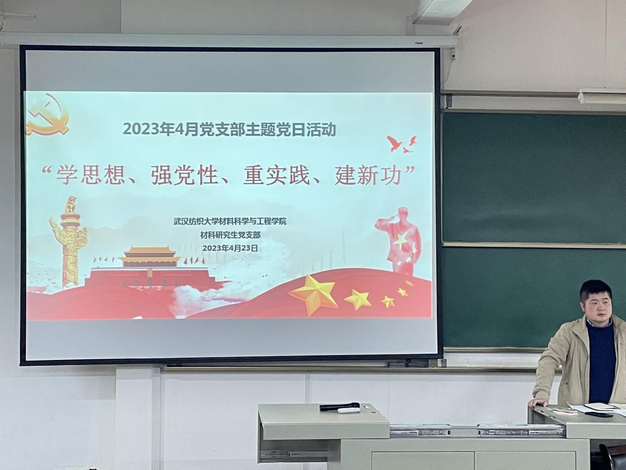 深入开展学习贯彻习近平新时代中国特色社会主义思想主题教育,强化研究生党性修养,402永利集团材科研究生党支部于2023年4月23日下午在8F-T101教室举办4月主题党日活动,支部书记为支部全体党员、积极分子带来题为《学思想、强党性、重实践、建新功》的党课。
