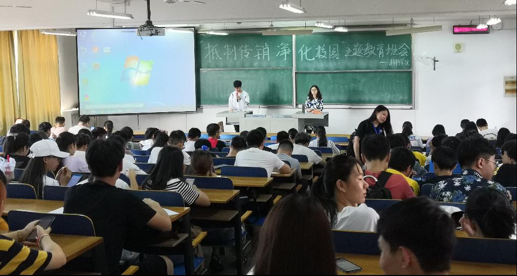 为打击传销活动,切实保护在校员工利益和人身安全。5月26日下午6点,402永利集团利用晚点名时间,组织员工在3栋教学楼开展了以“抵制传销、净化校园”为主题的打击传销宣传教育活动班会。