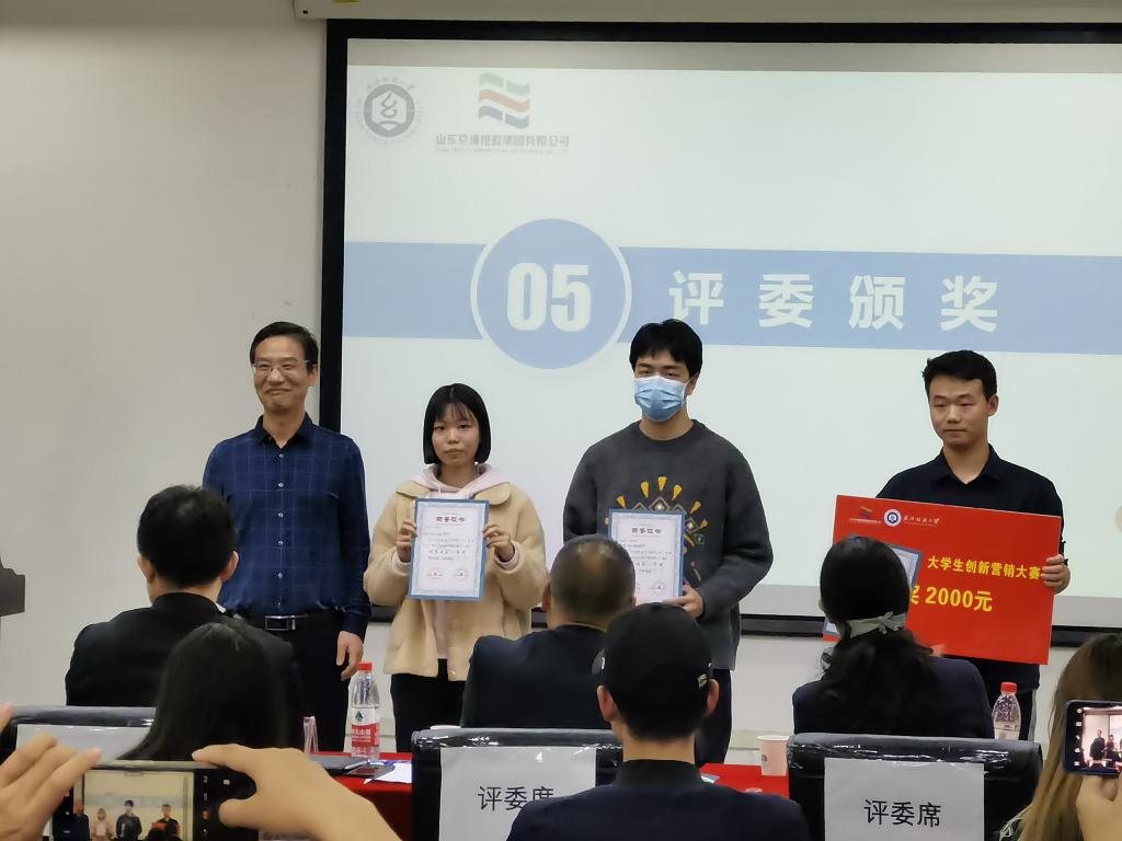 随后突围决赛的11支参赛队伍就营销策划方案和营销情况进行现场汇报,“Mask&Must”队口罩销量高达46260只,稳居销量榜首;“流云”队营销策划书完整详细,汇报热情洋溢,充满激情,获得最高分;“轻轻畅销”队率先将口罩营销和直播平台结合起来,推出自助式营销新模式,让人眼前一亮,获得评委的一致表扬。根据评分结果最终评选出金奖一组、银奖两组、铜奖三组以及创新营销案例奖三组,随后举行了颁奖仪式。