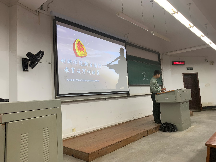 随后,老员工退役士兵晏松结合自己参军入伍的经历,向新生做了国防教育和军训动员,并鼓励新生参军入伍。晏松的报告展示了我国武装力量的构成、军旗和军衔等,引发了众多新生的兴趣。