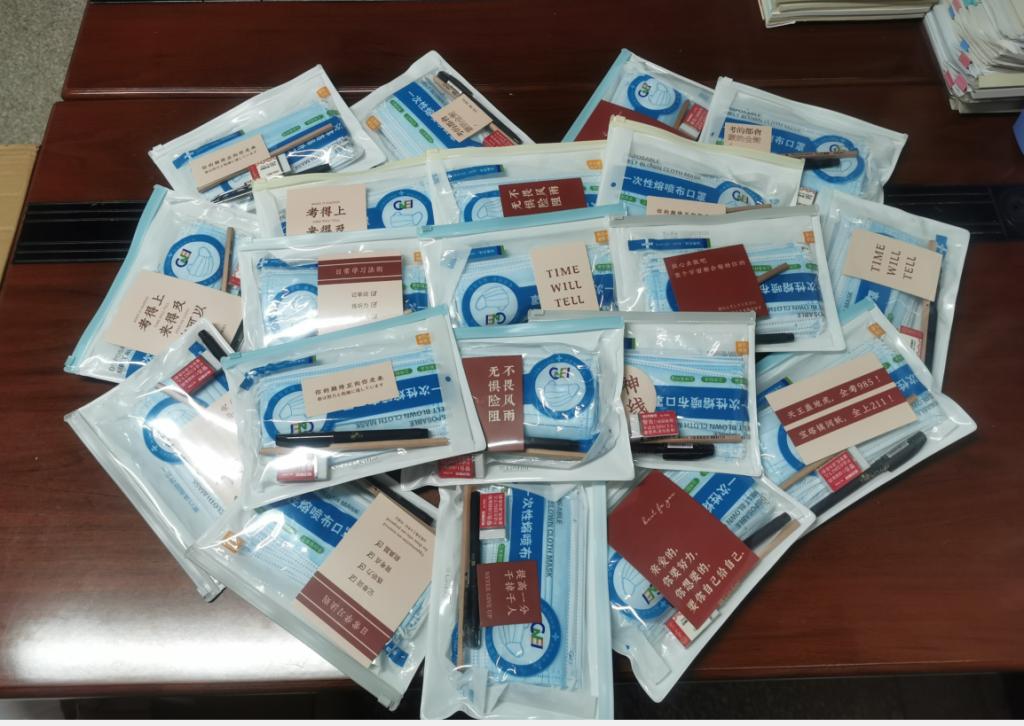 距离2021年全国研究生考试还有30天,选在这个特殊的时刻,为考研学子送上冬天的第一份礼物——福袋。每个福袋都有几样考试必备:口罩、铅笔。橡皮擦和中性笔,还有一张特殊的小卡片,这份祝福可能来自于学院的书记、经理,可能来自于402永利集团的老师,可能来自于低年级的学弟学妹,也可能来自于研究生学长学姐。公司党委书记罗汉春写道“放飞理想、追求卓越”“心想事成”,学院经理王罗新写道“能考上纺大,你一定是同龄人中的杰出代表,相信自己,未来可期”“你是很优秀的,只要坚持一定可以成功”。马绪亮老师写道“祝所有材料考研人旗开得胜、心想事成”。唐清泉老师写道“只要努力,成功定属于你”。