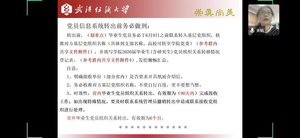 接着,黄老师为全体毕业生党员就党组织关系转接的重要性以及党组织关系转接的操作流程依次进行了详细解读,为党员们接下来的组织关系以及组织生活递交了接力棒。