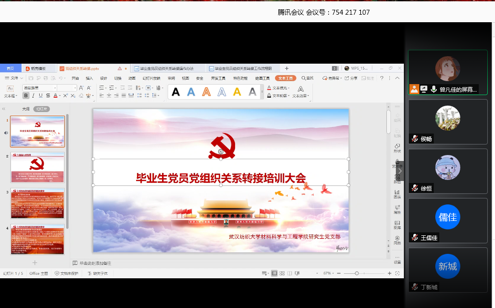 为进一步做好2020届毕业研究生党员教育管理工作,教育引导广大毕业生党员进一步增强“四个意识”、组织观念和纪律观念,切实发挥党员的模范带头作用,5月18日晚,402永利集团通过腾讯会议在线召开毕业研究生党员离校教育大会,公司党委副书记侯畅、研究生党支部支委及全体毕业生党员参加大会。大会由研究生党支部副书记曾凡佳主持。