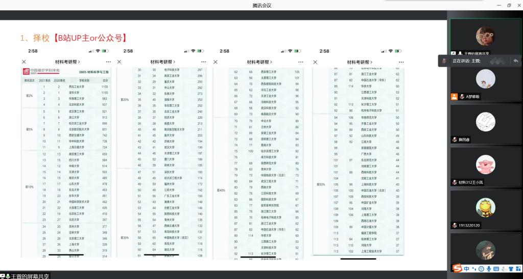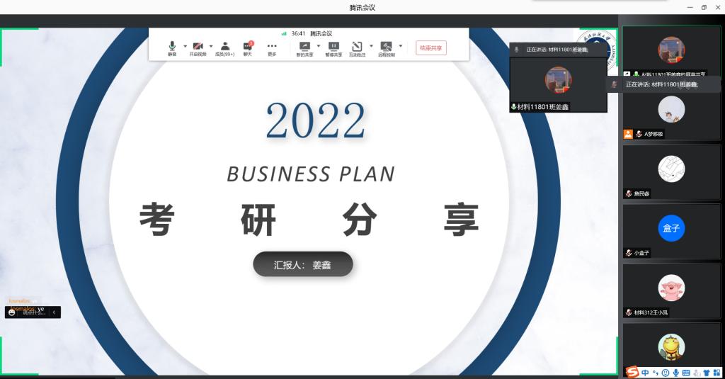 下午两点半分享会正式开始,首先由2021届毕业生许世杰分享择校和考研时间分配等相关内容,结合备考天津大学的经验,分析如何选择适合自己的学校和专业;随后,姜鑫分享了武汉理工大学材料专业的相关信息,武汉理工大学作为每年报考最热门的学校之一,同学们都纷纷提问,姜鑫结合备考时间安排,详细为19级学弟学妹们讲解;最后王萱分享了参加中国地质大学(武汉)夏令营的经历,详细介绍了如何收集各大高校夏令营的信息,以及如何报名等内容。