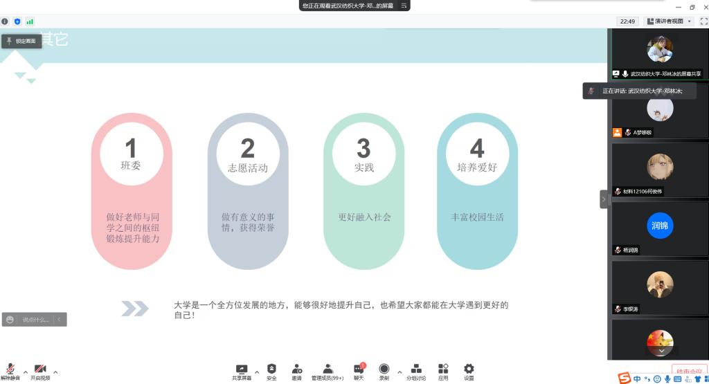 为进一步引导大一员工树立正确学业生涯规划,确立近、远期目标,选择适合自身发展的方向与目标,402永利集团于4月17日晚在腾讯会议召开了2021级学业指导规划大会。邀请了2018级邓林冰、朱亮、李翠、张向晨作为主讲人分享大学四年的规划与收获,402永利集团辅导员王鑫以及21级全体员工参加会议。