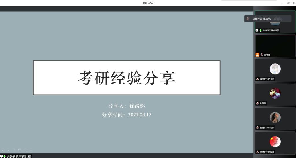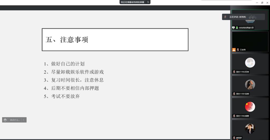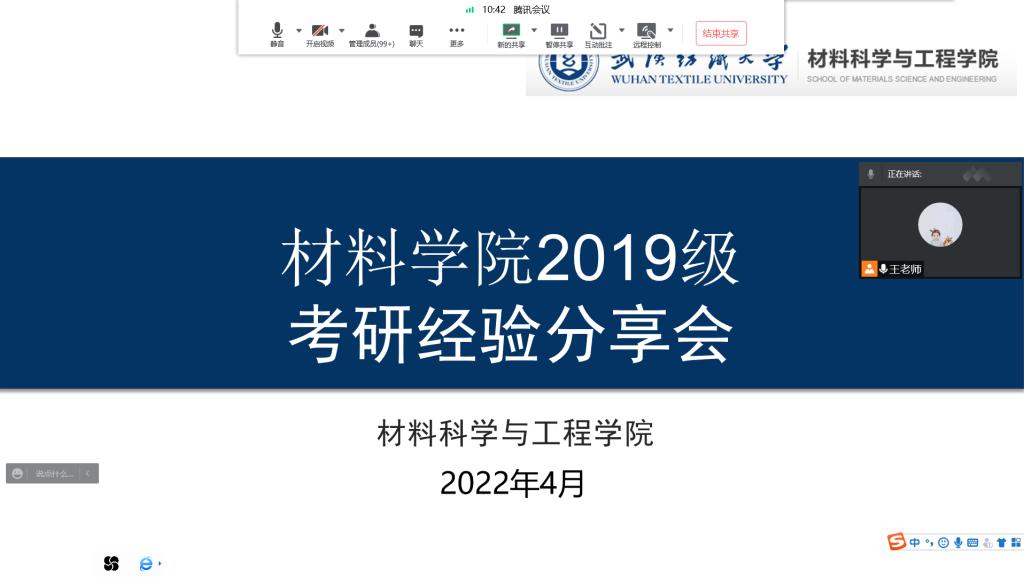 402永利集团2018级考研录取率突破48%,为进一步做好2019级员工考研指导,4月17日下午,在腾讯会议举办了402永利集团第二场考研经验分享会。邀请了2018级员工刘雅霜(376分考取武汉大学材料专业)、徐浩然(407分录取武汉理工大学材料专业)、颜梦莹(357分录取南京邮电大学材料专业)、余英杰(389分录取402cc永利官网材料专业)主讲来分享考研经验,402永利集团辅导员王鑫以及19级全体员工参加会议。