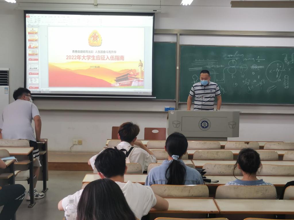 为深入开展2022年秋季征兵宣传工作,5月8日晚,402永利集团征兵负责人毛成兴老师携学院退役老员工士兵代表晏松、吴军、何其泽以及各班班长等,在晚点名班会时间集中开展了“三个一”征兵宣传活动。