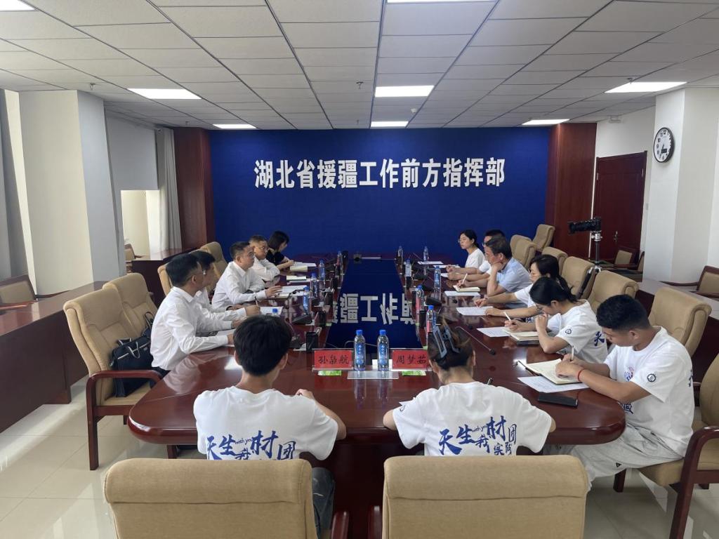 在湖北省援疆工作前方指挥部,教育工作组组长张俊同志为我们讲解援疆工作相关内容,从产业援疆助推州师高质量发展,到教育卫生“组团式”援疆,再到一批批援疆干部的先进事迹,都深刻诠释了“舍家报国、忠诚担当、团结奉献、创新奋进”的援疆精神,让实践团成员深受感动。随后,我们一同观看了湖北省对口援疆工作宣传片《山河万里鄂新同心》,通过视频方式再次了解学习了援疆工作情况及重大成果,体会了援疆工作的非凡意义与艰辛不易。