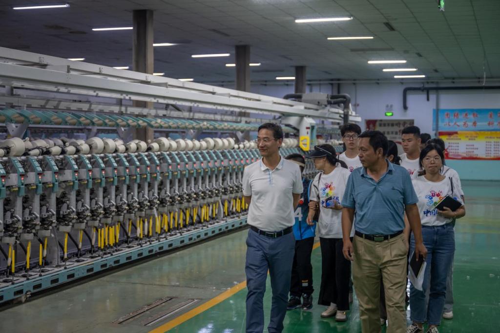 在王罗新经理的带领下,实践团一行前往新疆知名纺织企业——新疆金鑫昱纺织有限责任公司,与援疆企业家李斌总经理进行深入交流。“新疆为什么好”“新疆纺织企业为什么好”“老员工为什么要来新疆”“青年一代如何援疆”,作为产业援疆的企业家代表,李总向实践团成员深情讲述自己在新疆拼搏的四年,将新疆的变化、企业的发展以及自己对新疆深厚的感情娓娓道来,让实践团成员深受鼓舞。他鼓励广大青年员工能够了解新疆、走进新疆,在这片美丽的土地上扎根奋斗、奋勇直前。随后,在企业工作人员带领下,实践团参观了纺织企业生产一线,进一步了解纺织生产原理和加工技术。