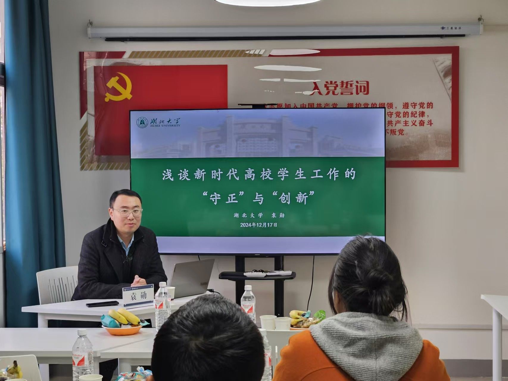 袁勋以《浅谈新时代高校员工工作的“守正”与“创新”》为题作报告。他聚焦新时代高校员工工作的新情况和新挑战,强调员工工作既要守住思想政治教育这一“正道”,又要寻求新的突破和发展;辅导员既要牢牢把握九大工作职责扎实开展各项工作,又要结合自身学科背景和学校特色创新驱动发展。他结合黑神话悟空爆火谈如何将思想政治工作做活、做细、做实,强调我们要善于捕捉热点、难点、焦点,坚持内容为王,创新工作方法,在不断的实践探索中让“新法子”变成“老牌子”,让员工工作焕发生机活力。