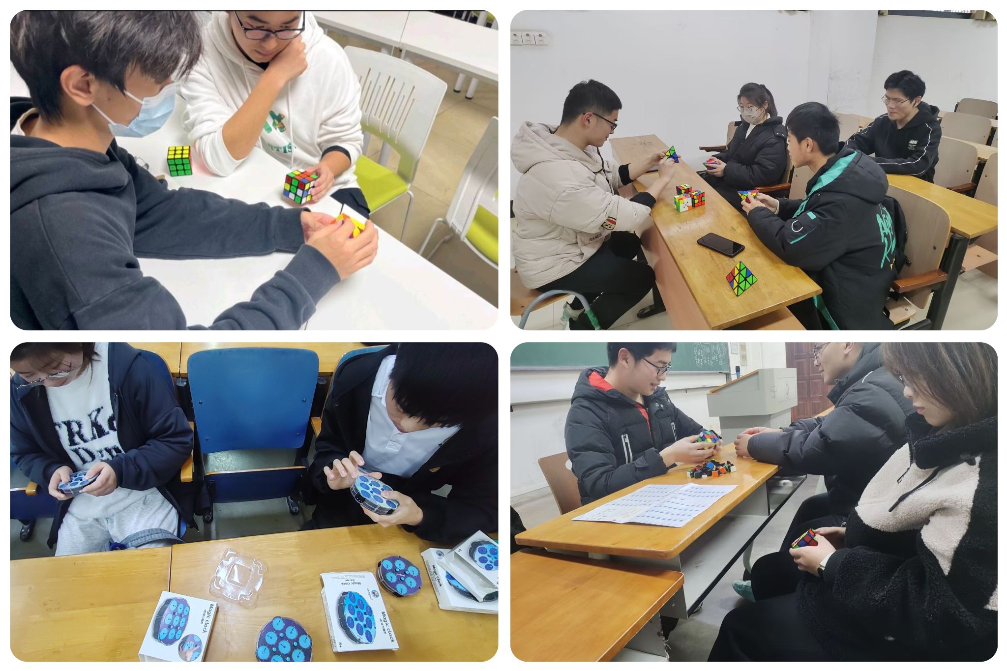 魔方社团成员们精心布置的场地,活动现场摆放着各种类型的魔方,从常见的三阶魔方到复杂的多阶魔方,从标准的立方体魔方到异形魔方,琳琅满目,令人目不暇接。魔方社团负责同学陈建豪详细介绍了魔方的起源、发展历程以及在数学、逻辑思维等方面的应用。通过生动的讲解和丰富的实例,同学们对魔方有了更深入的了解,也认识到魔方不仅仅是一种玩具,更是一种锻炼思维能力、培养耐心和毅力的有效工具。