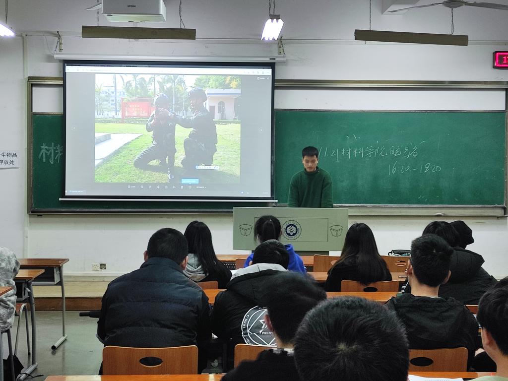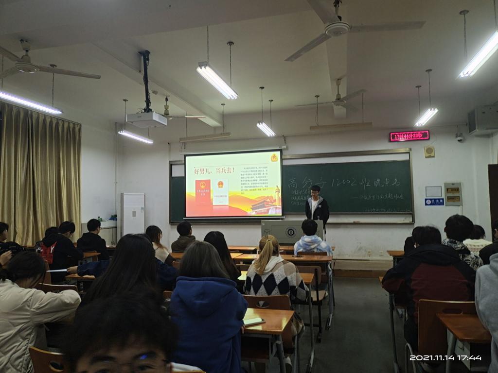 而在各班级的“携笔从戎 青春报国”主题班会上,同学们纷纷响应,积极了解入伍政策畅谈想法。材科12002班的刘超,参加了9月份的役前训练,感触颇深,为同学们分享了自己的训练感受。